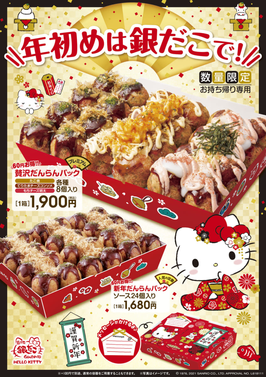 築地銀だこの「ハローキティ 新年だんらんパック」と「ハローキティ 贅沢だんらんパック」は、2021年1月1日(金)より数量限定で発売です☆