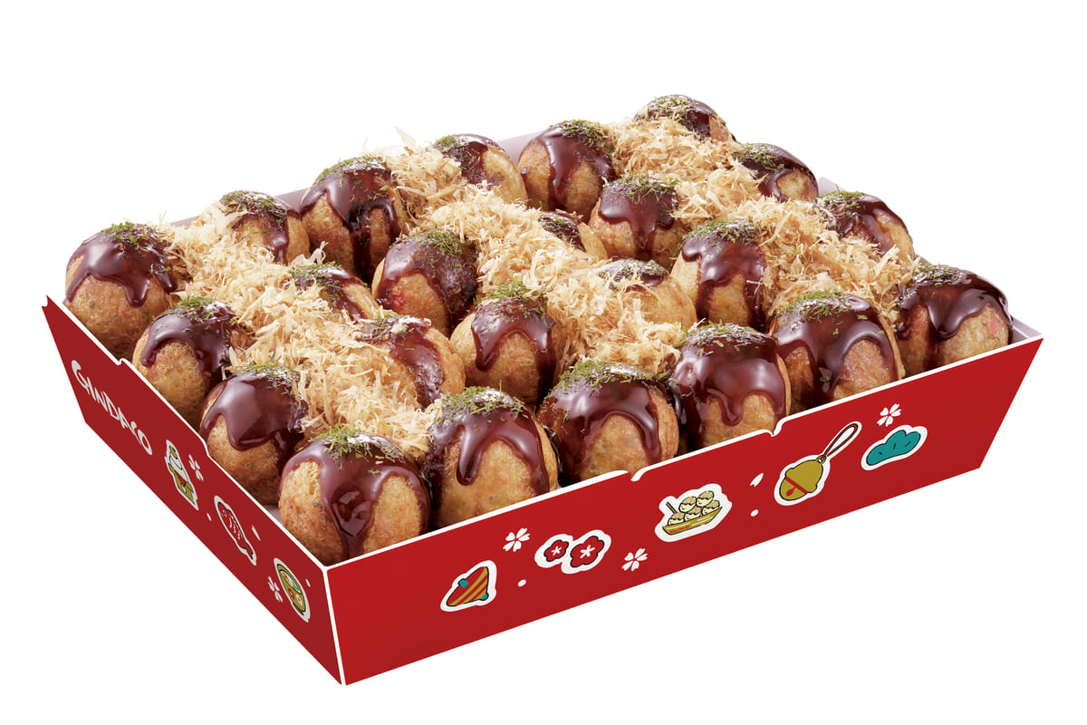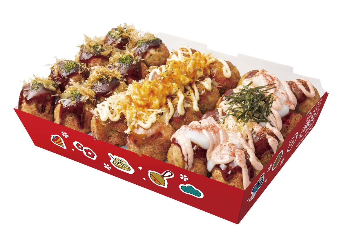 今回のコラボ商品 「ハローキティ 新年だんらんパック」は、ソースたこ焼が24個入り、「ハローキティ 贅沢だんらんパック」 は、ソースたこ焼、てりたまチーズコンソメ、もちチーズ明太が各種8個入った24個入りの2種。