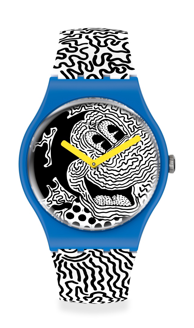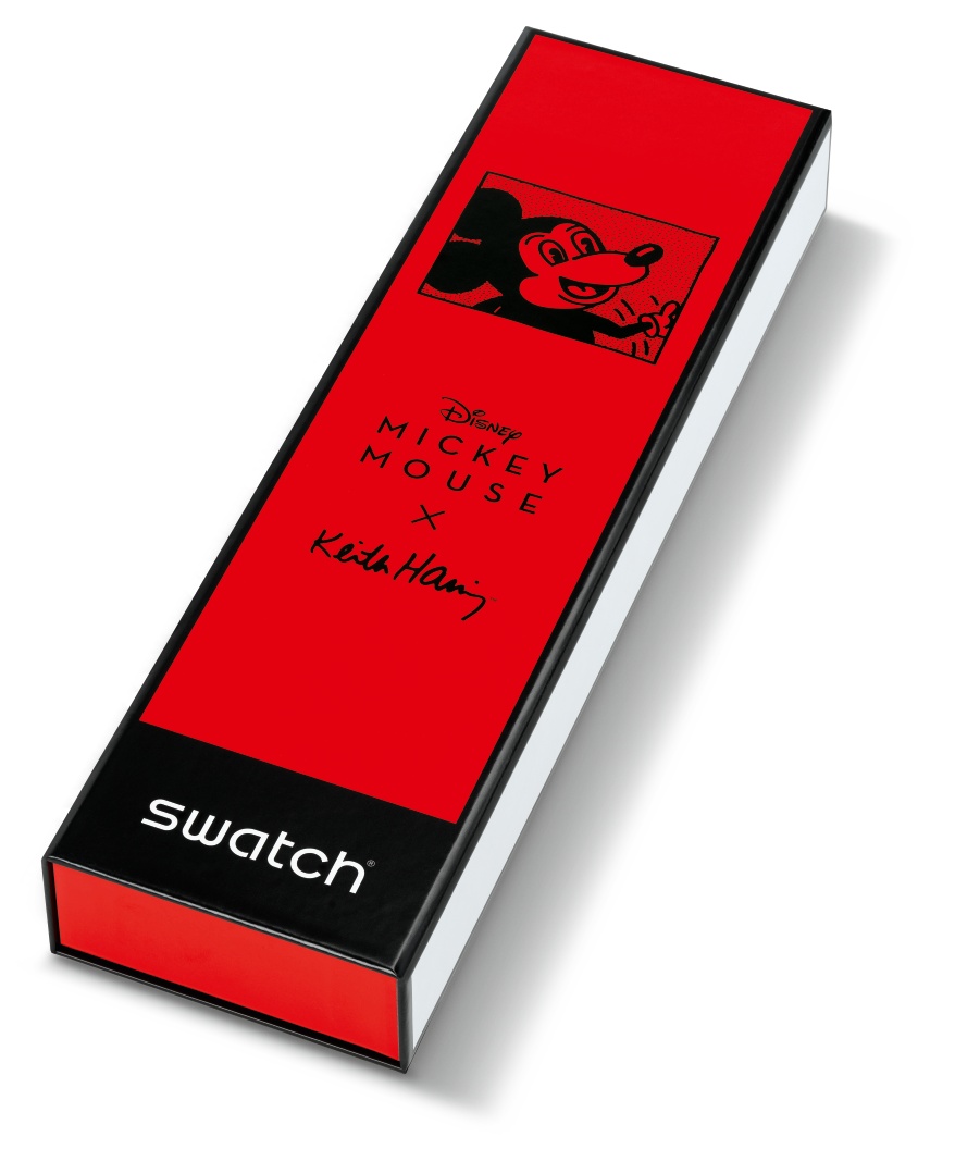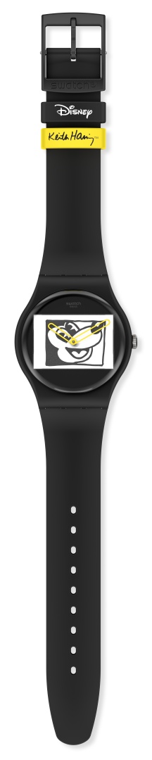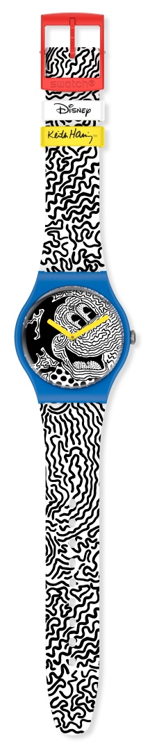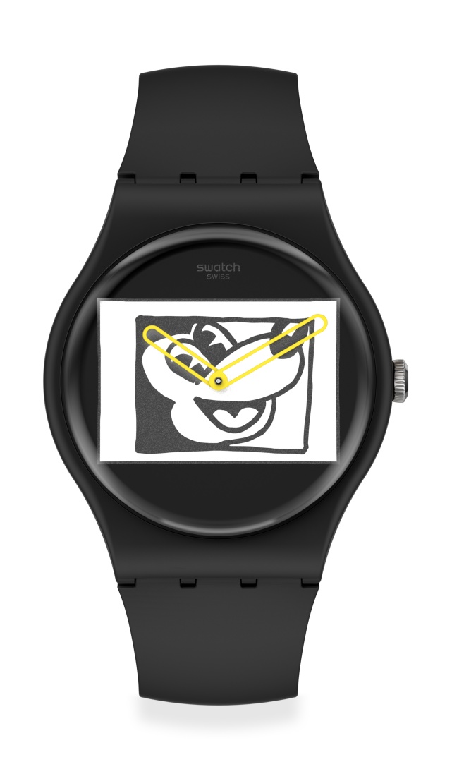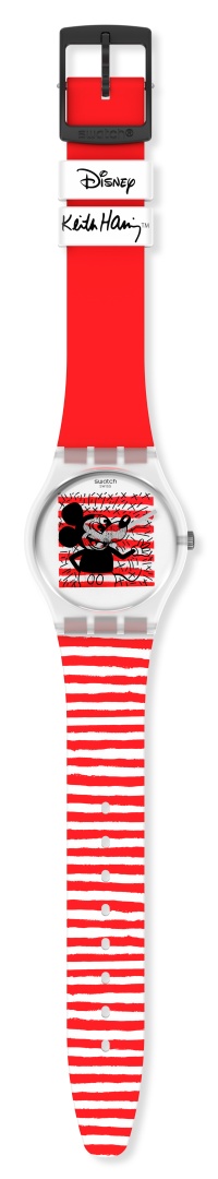 ヘリング氏のトレードマークである魅惑的な白と黒の曲線が得意満面の「ミッキーマウス」を描き出し、スウォッチらしい原色がアクセントになっています。