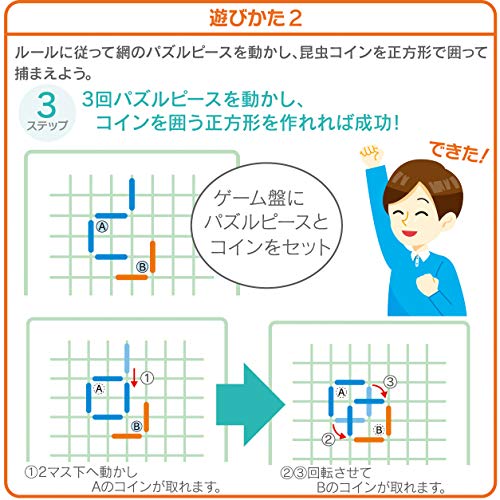 虫取り網をイメージしたパズルピースを、縦横に移動させたり回転させたりして、虫に見立てたコインを囲みます。