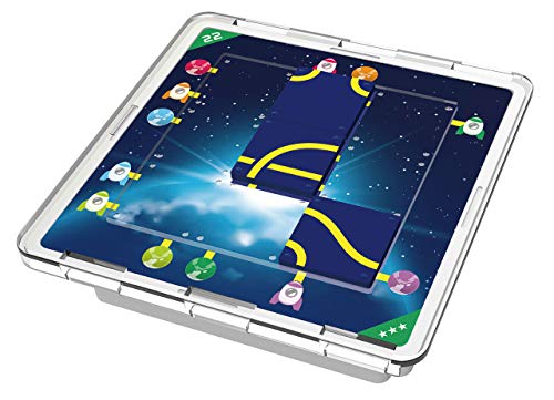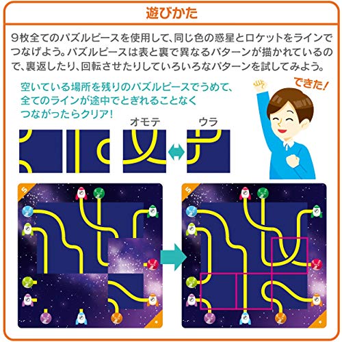 同じ色のロケットと惑星が繋がるよう、盤上にラインが入ったピースを並べるゲームです。