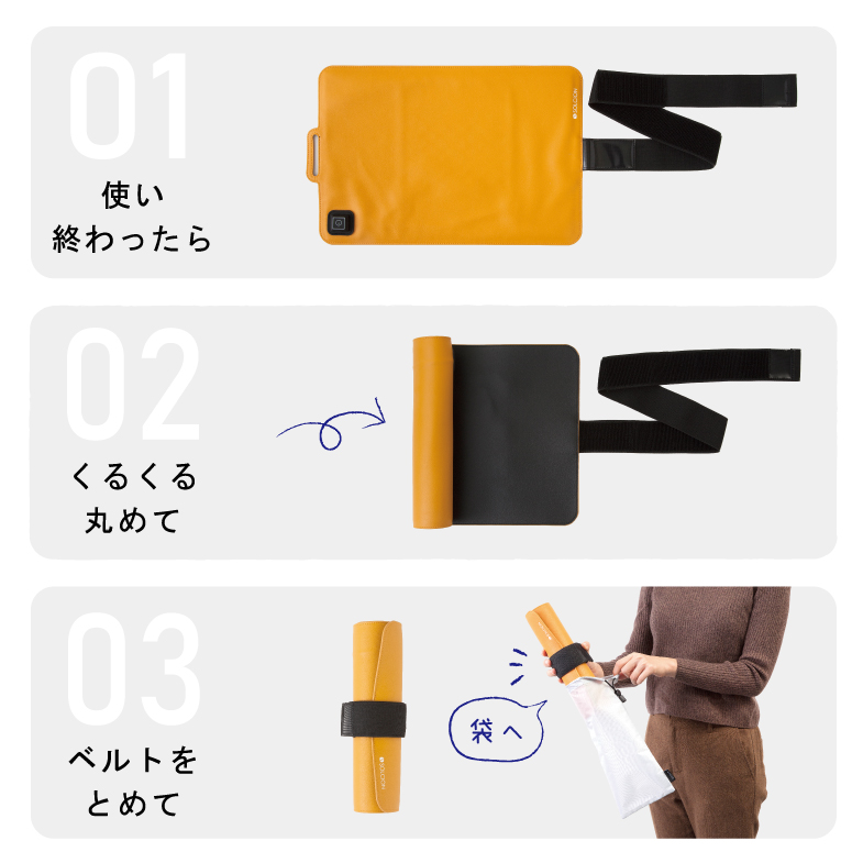 くるくる丸めて持ち運びでき、気になる腰回りや足元の冷えをどこでもすぐに温めてくれる便利グッズです☆