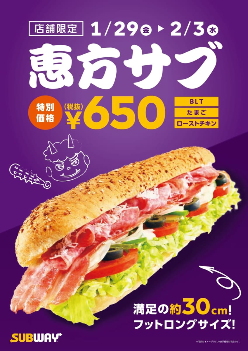 また、2021年1月29日(金)から2021年2月3日(水)までの節分期間限定で、約30センチのフットロングサイズをお得な価格で楽しめる『恵方サブ』も発売されます☆