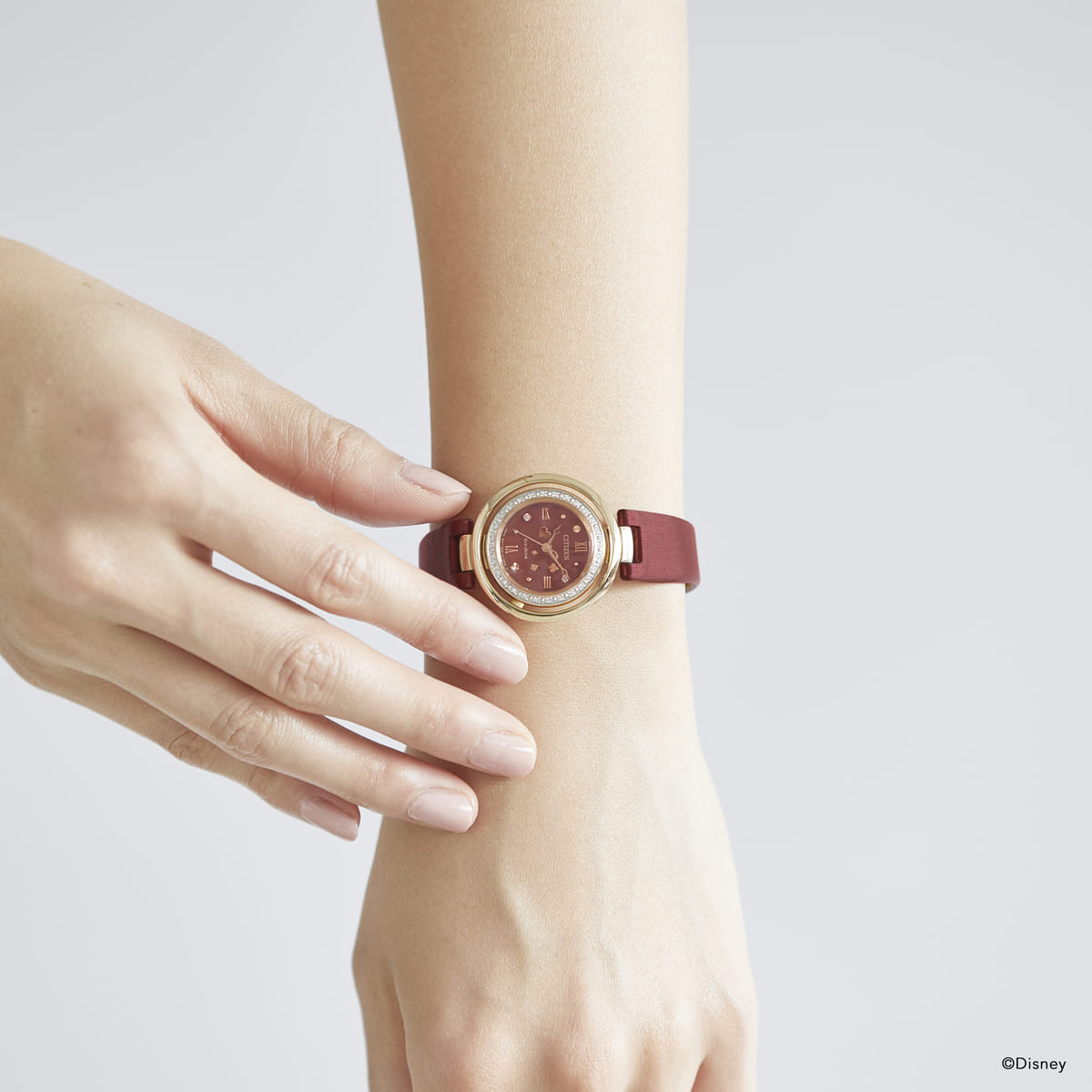 華やかな輝きを放つ白蝶貝文字板にさりげなく入った「ディズニーマリー」のトレードマーク、ピンクのリボンが大人かわいい限定モデルです。