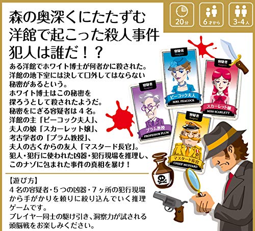 ある洋館で起きた殺人事件について、カードのヒントをたよりに犯人・凶器・殺害現場を推理していきます。