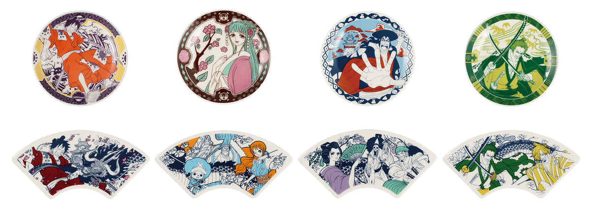 おてしょ皿の丸皿は、ワノ国を代表する4キャラクターを和柄で、扇皿はワノ国での衣装を着用した麦わらの一味を春夏秋冬で表現。