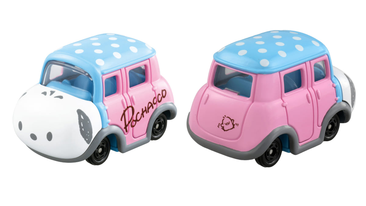 ピンクの車体に水色の屋根がポップな「ポチャッコ」のトミカです。