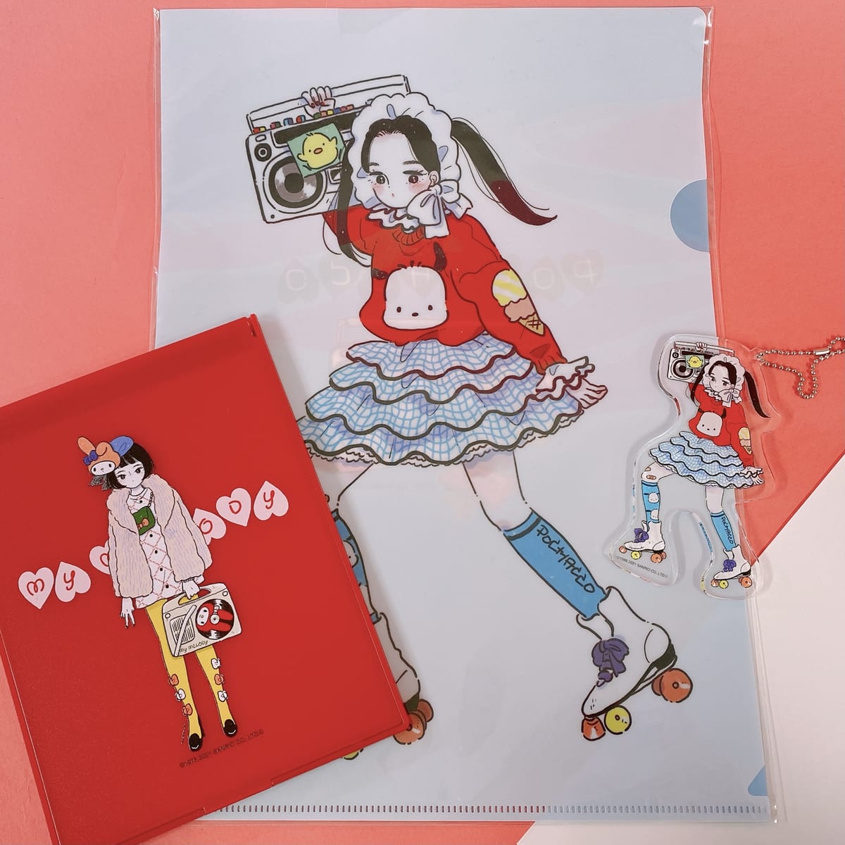 かわいい女の子とサンリオキャラクターたちが描かれたグッズは、レトロな雰囲気でおしゃれです☆