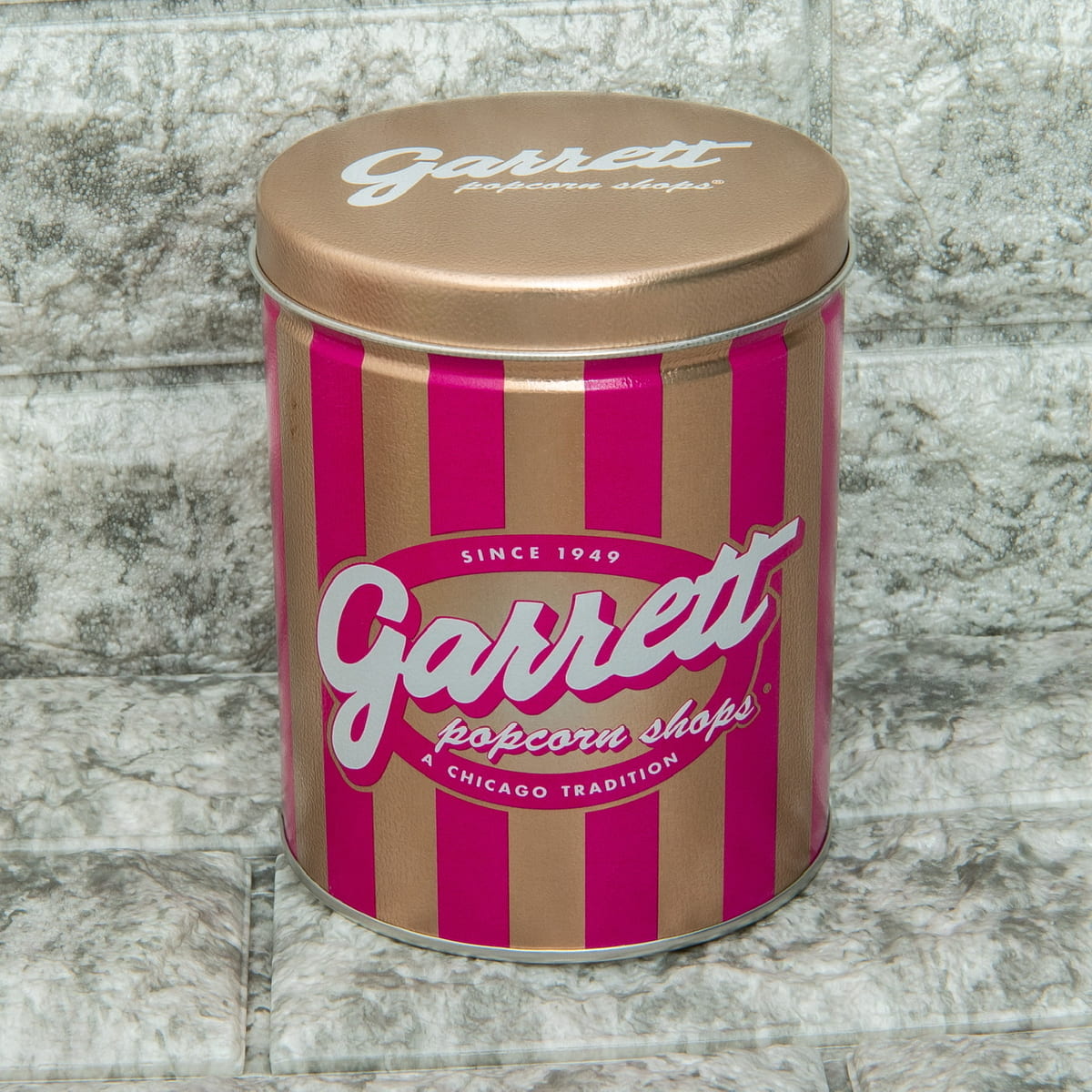 「Candy Pink缶」は、ギャレット定番のシグネチャーストライプを、ビビットなピンクとシャイニーなゴールドでアレンジしたデザイン。