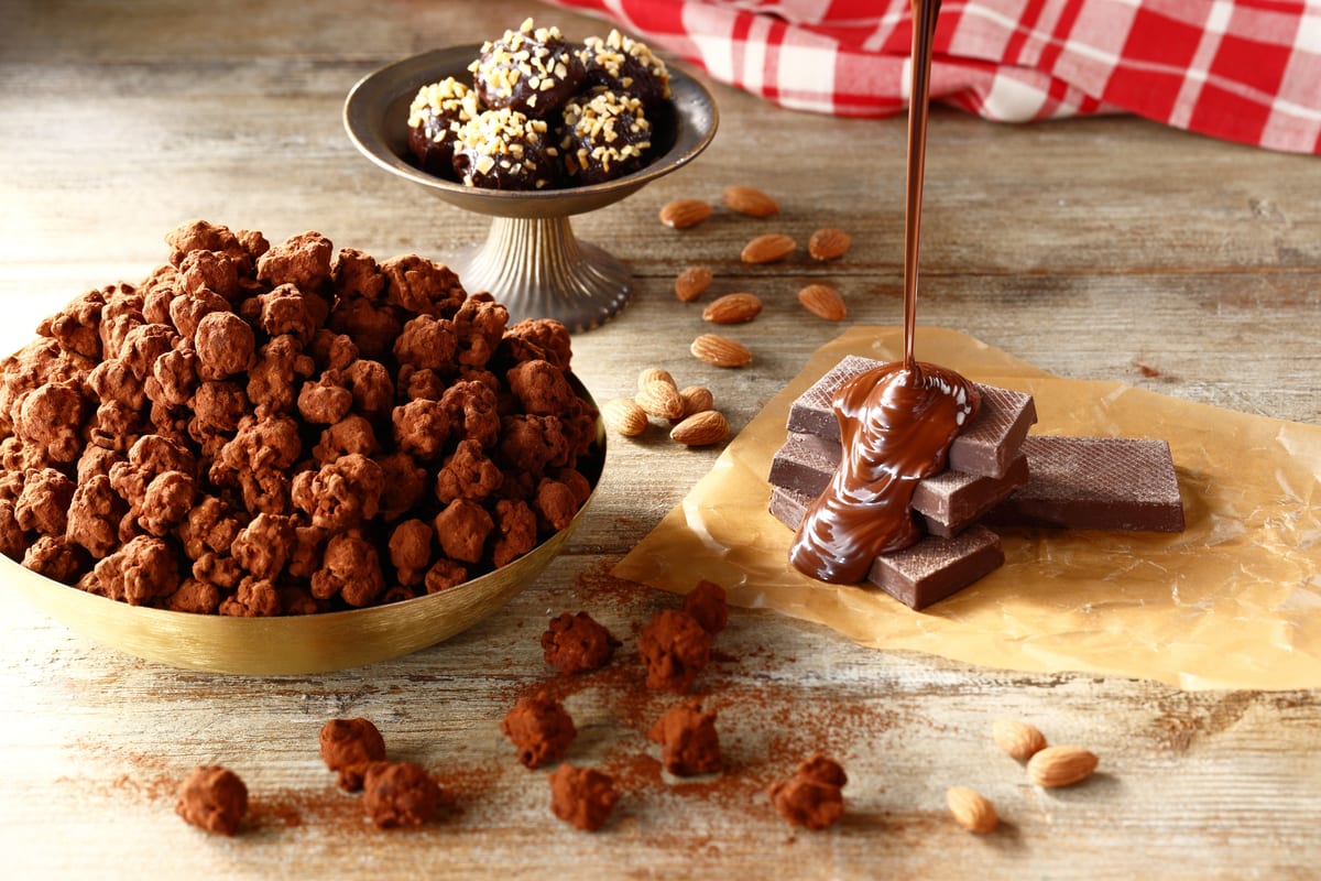 口の中でとろけるなめらかなミルクチョコレートとほろ苦いココアパウダーの組み合わせに、アーモンドの香ばしさとつぶつぶとした食感をプラス。