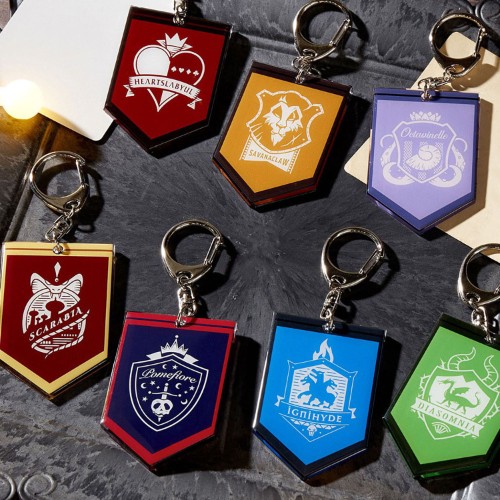 原色カラーを取り入れたキーホルダーに、白抜きされた寮章が映えます。