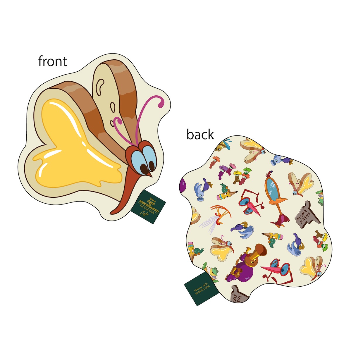 「バタつきパン蝶」がプリントされた「ダイカットクッションA」や