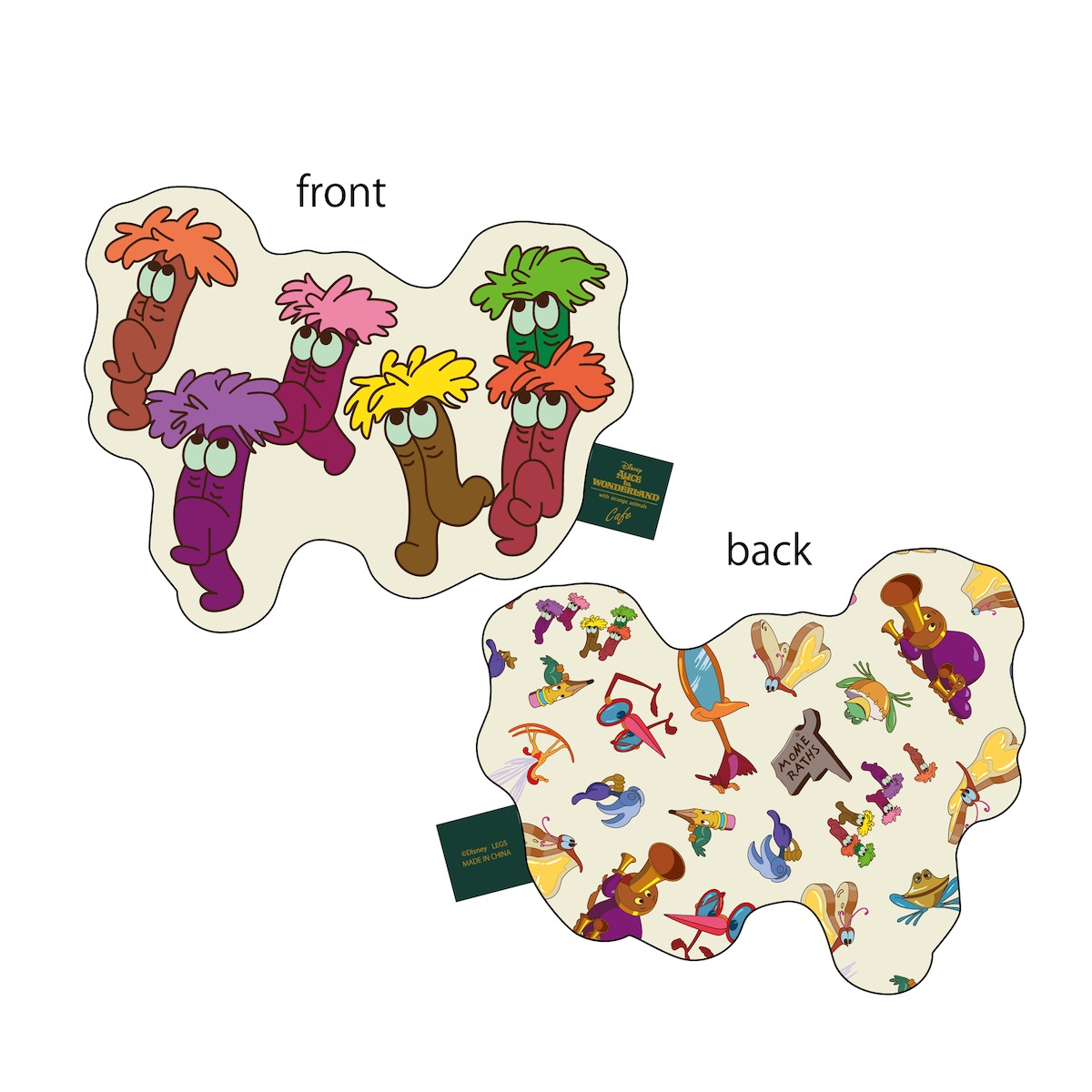 オモテ面にふしぎな生き物たちの総柄、ウラ面にはカフェのロゴがプリントされています。