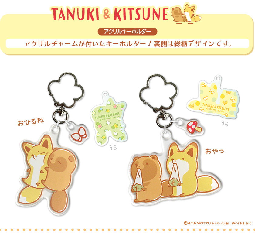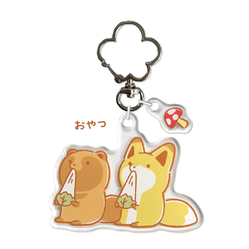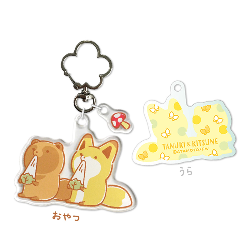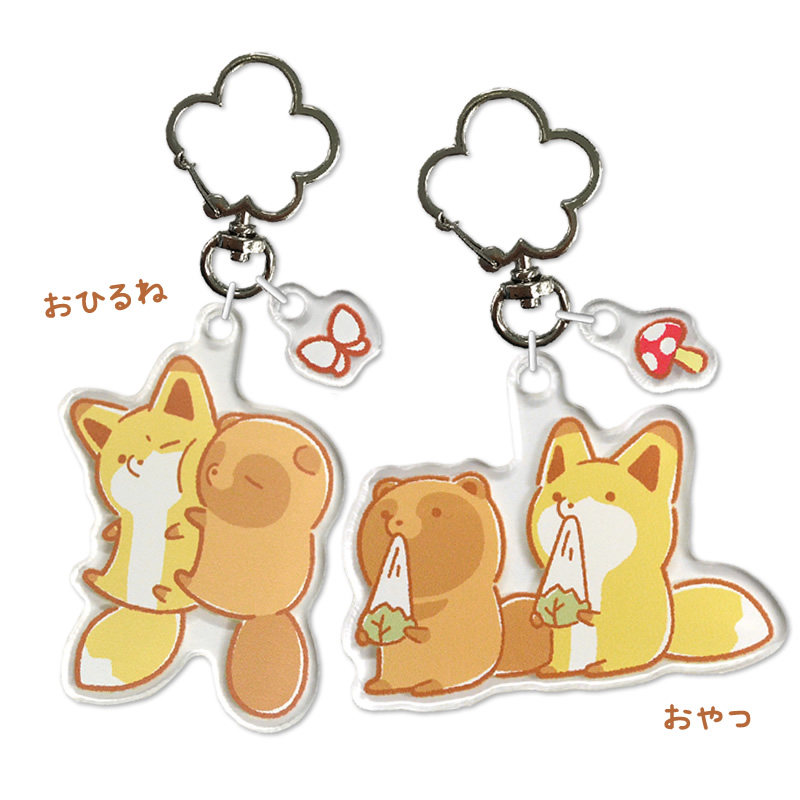 『タヌキとキツネ』の、ミニチャームがついたアクリルキーホルダー。