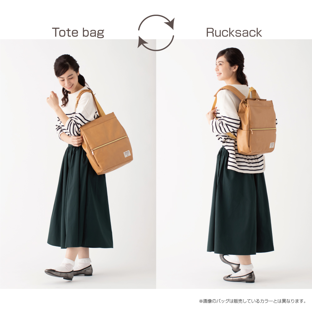 本体からのびる肩紐の取手を出し入れするだけで、トートとリュック、どちらの使い方にも早変わり!