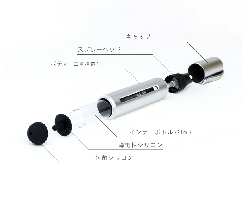 二重構造のボディは光があたりにくく、紫外線によるアルコールの劣化を抑えてくれます。