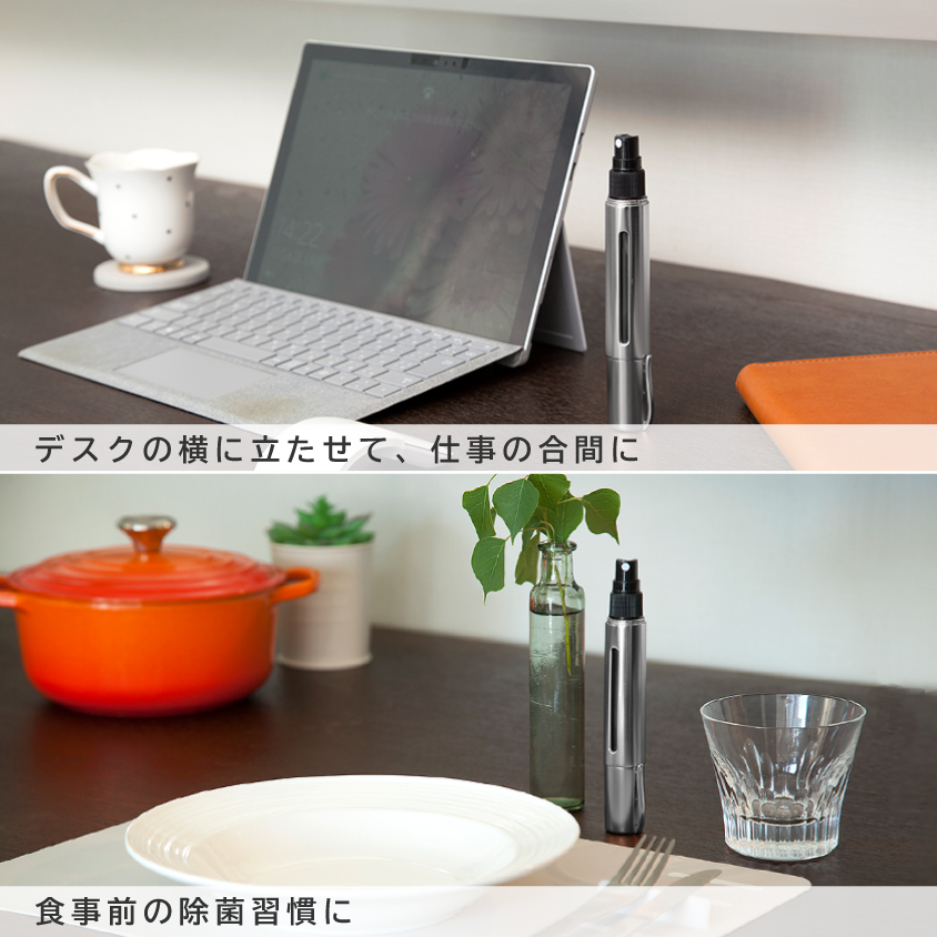 デスクに置くのはもちろん、食卓に置いてテーブルの除菌や、飲食の前のエチケットとしても便利に使えます。
