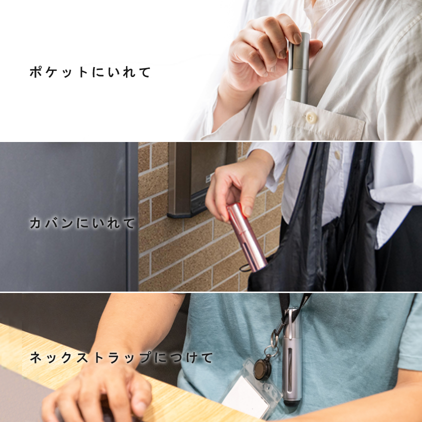 いつでも手軽に除菌でき、素手のかわりにボタンを押せるお守りアイテム。
