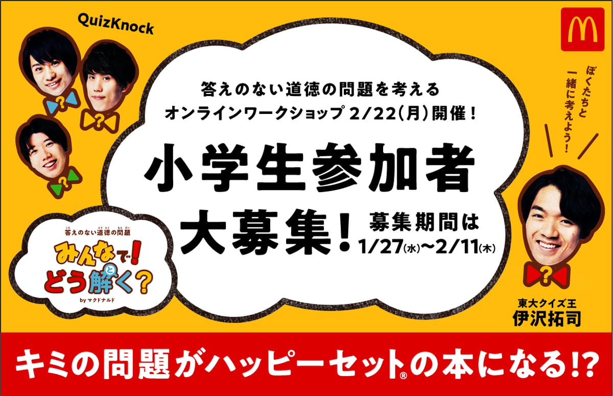 QuizKnock はこの度、日本マクドナルドよりお話をいただき、子どもたちの心と身体の健全な成長を願う姿勢や、「答えのない問いについて考えたり話し合ったりする機会を設けることで、子どもたちが自発的に問いと向き合う姿勢を育みたい」というプロジェクトの趣旨に強く賛同し、本プロジェクトに参画する運びとなりました。