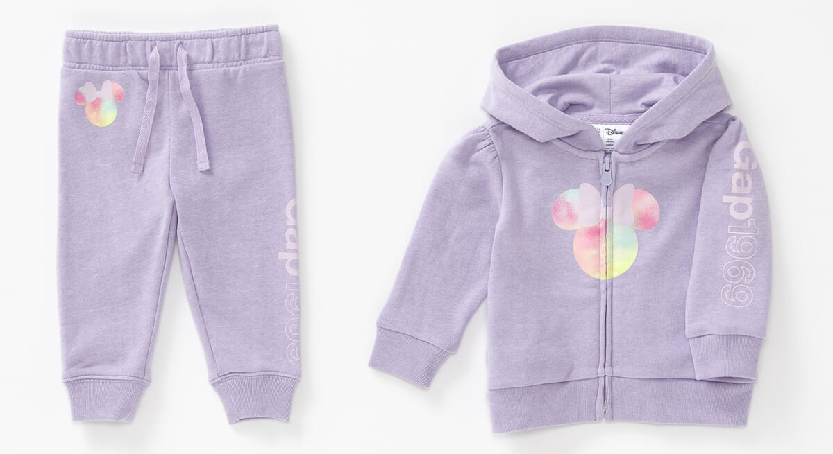 ベビーラインには、Gapロゴとレインボーカラーの「ミニーマウス」がプリントされたセットアップが登場。