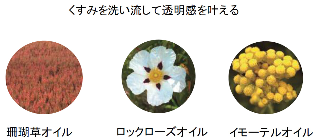 くすみを洗い流し、透明感を与える「珊瑚草オイル」「ロックローズオイル」「イモーテルオイル」を配合。