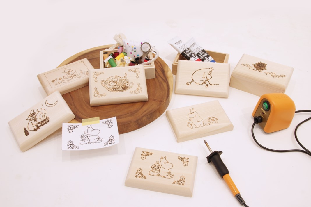 ウッドバーニングという技法で、ムーミンバレーパークオリジナルのデザインをウッドボックスに描きます。