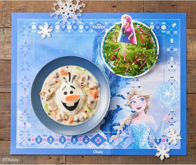 食卓が一気に「アナと雪の女王」の世界観となるビッグランチョンマットや、サラダがスカートのようになる「アナ」のサラダ用ピック、「オラフ」の顔をかたどった台紙がついているミールキットです☆