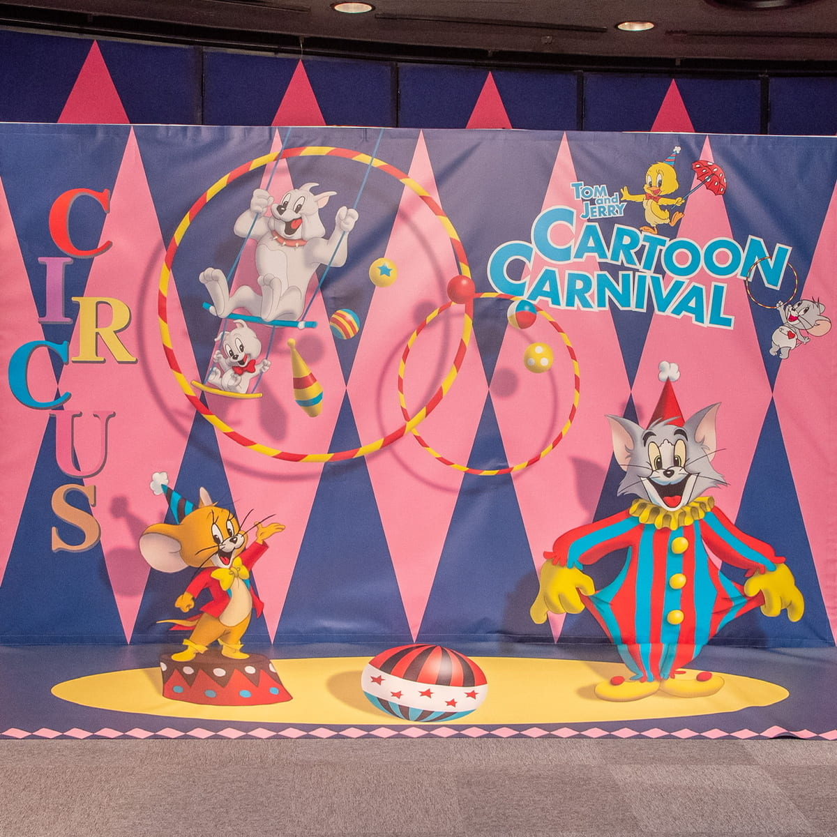 “カートゥーンカーニバル”の大きなサイネージと「トム」と「ジェリー」が行進しているようなにぎやかなグラフィックの数々が並びます。