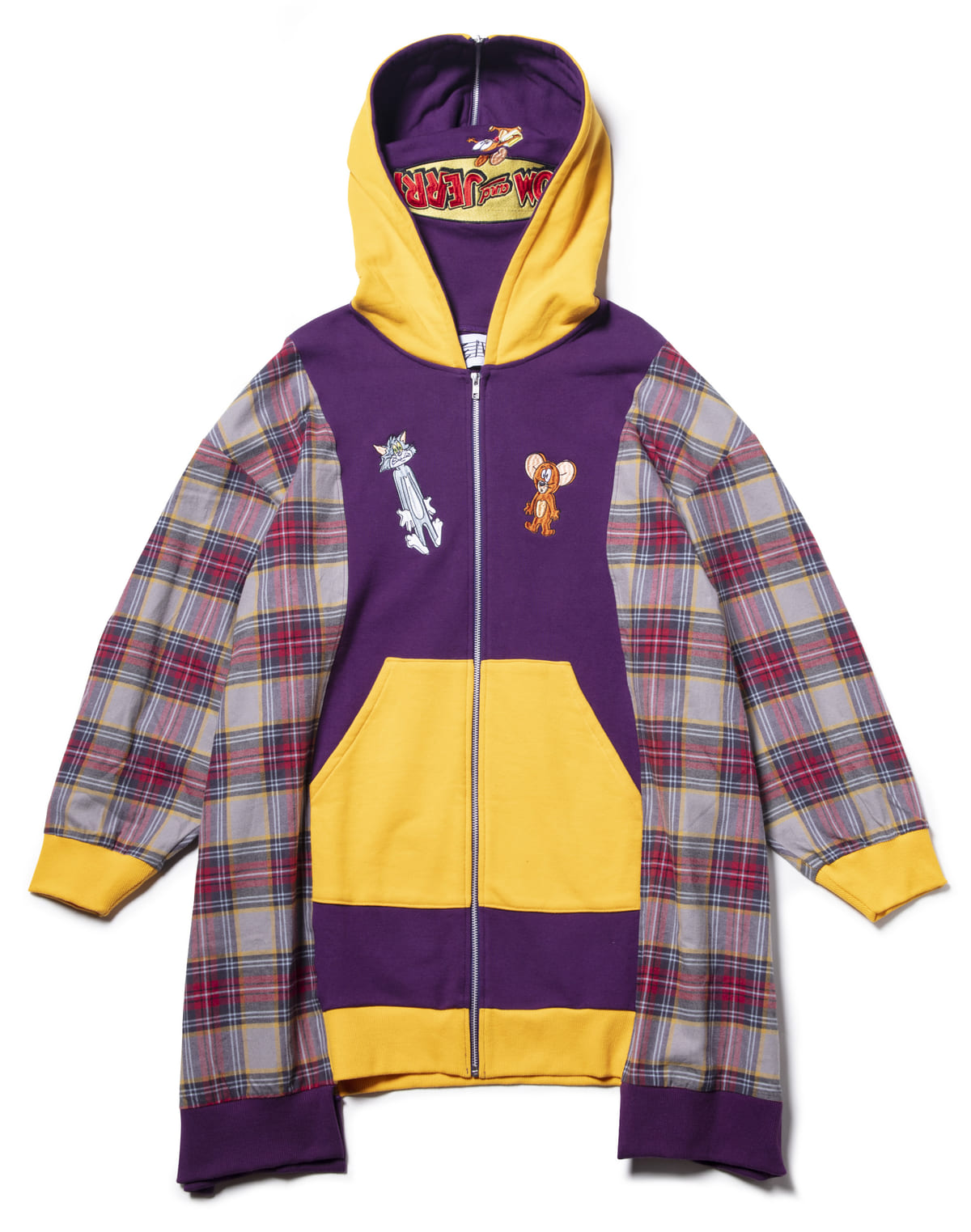 パープルとイエローの原色カラーをベースにしたフーディーには、驚いた表情の「トム」と「ジェリー」が刺繍されています!