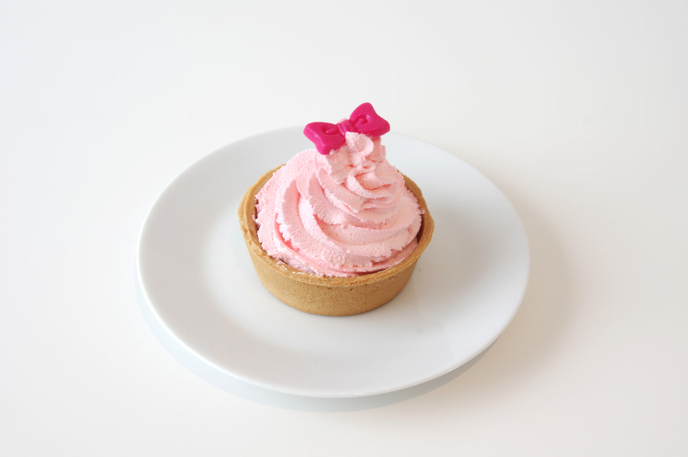 ピンク色のクリームでおおわれたクッキータルトの中には、ヨーグルトホイップといちごスライスのソースが隠れています。