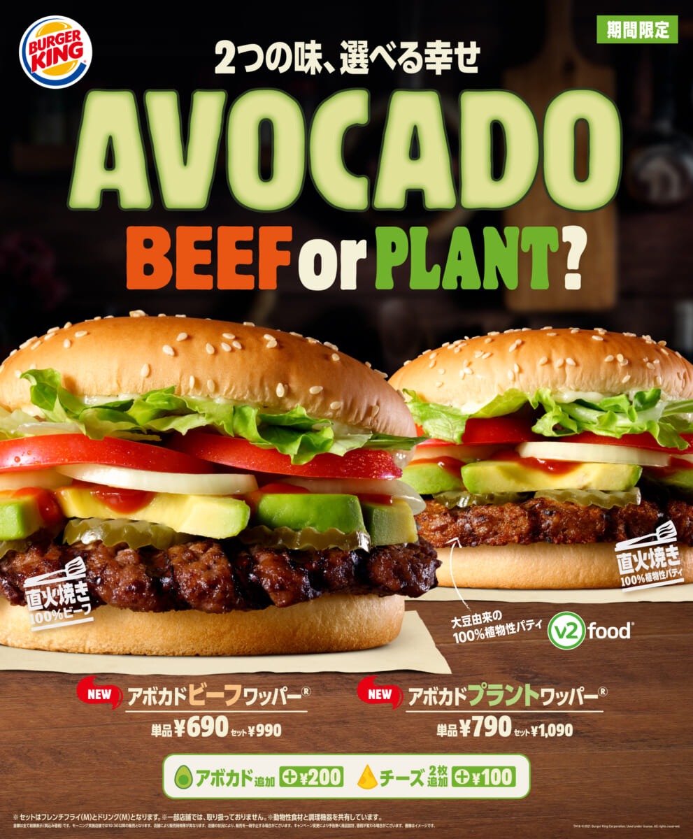 バーガーキング自慢の直火焼きで仕上げた、100%ビーフパティの「アボカドビーフワッパー」と、大豆由来の100%植物性パティの「アボカドプラントワッパー」の2種類です。