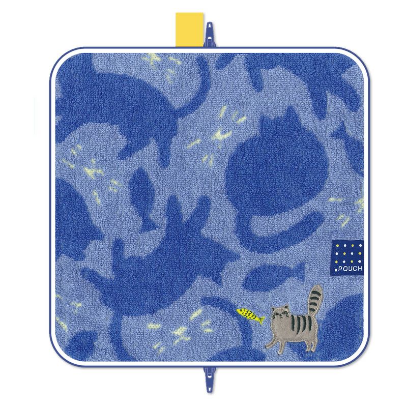 落ち着いたブルーの「ネコ」柄のどっとポーチ。