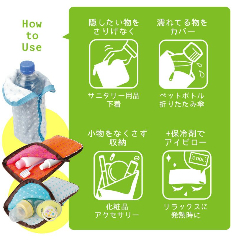 どっとポーチはタオル素材で出来ているので、ペットボトルや折り畳み傘など濡れたものの収納や、歯磨きセットや化粧品を持ち歩く際のポーチとしても使える、便利なポーチです。