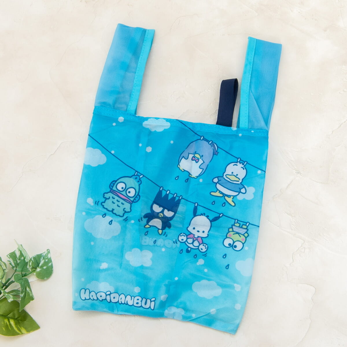 「ポチャッコ」、「タキシードサム」、「けろけろけろっぴ」、「バッドばつ丸」、「ハンギョドン」、「あひるのペックル」が洗濯物のように干されている楽しいデザインです。