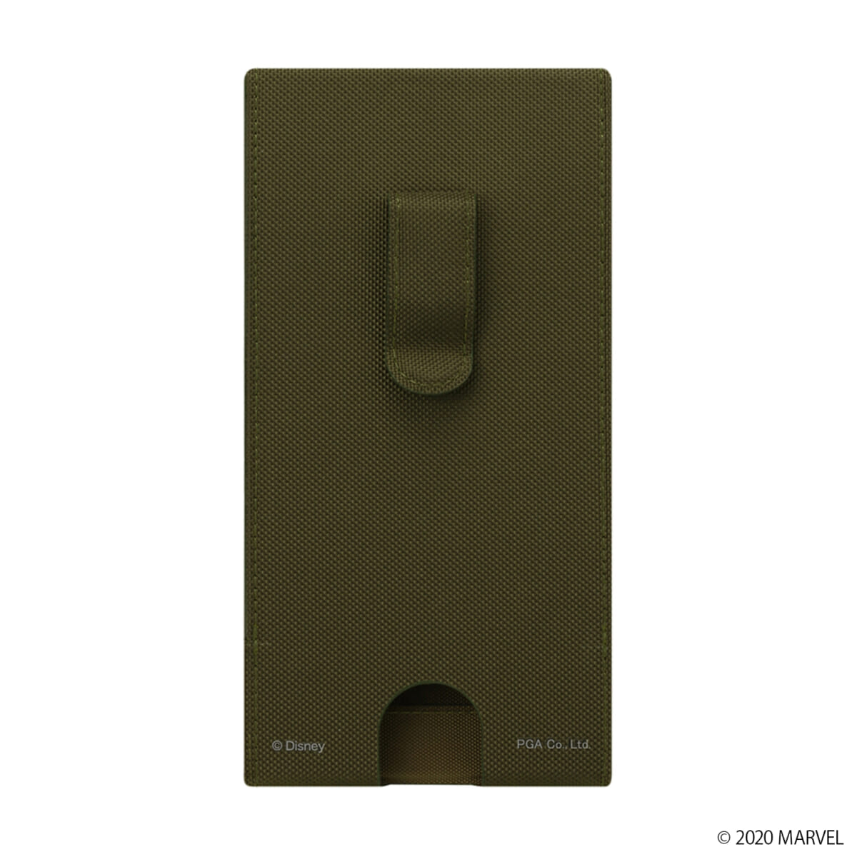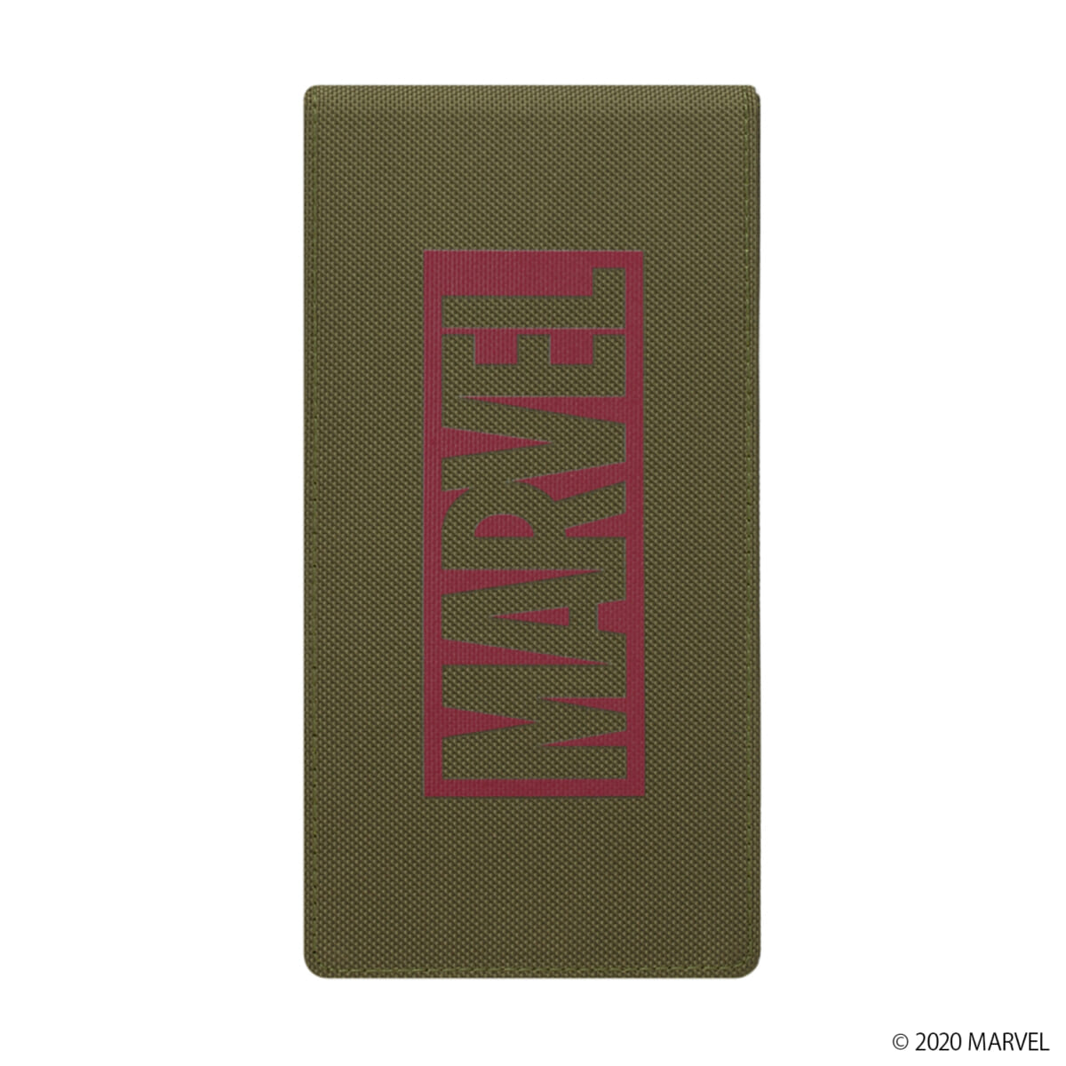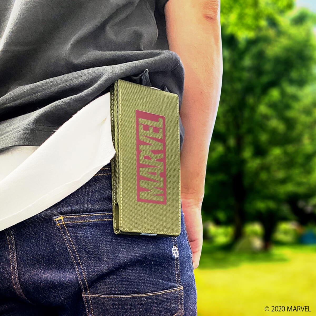 紫の「MARVEL」ロゴとカーキがおしゃれなスマートフォン用ウエストポーチ。