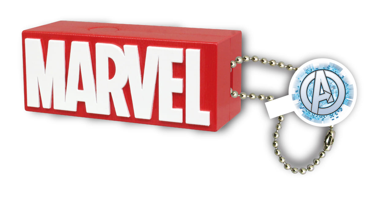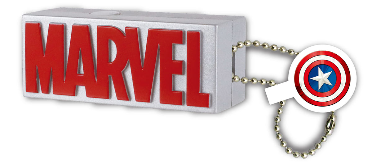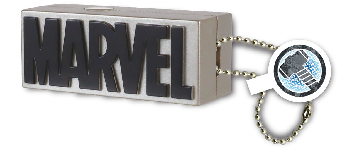「マーベルロゴ プロジェクションキーホルダー2」は、ヒーローたちのアイコンが投影できるプロジェクターのようなキーホルダー。