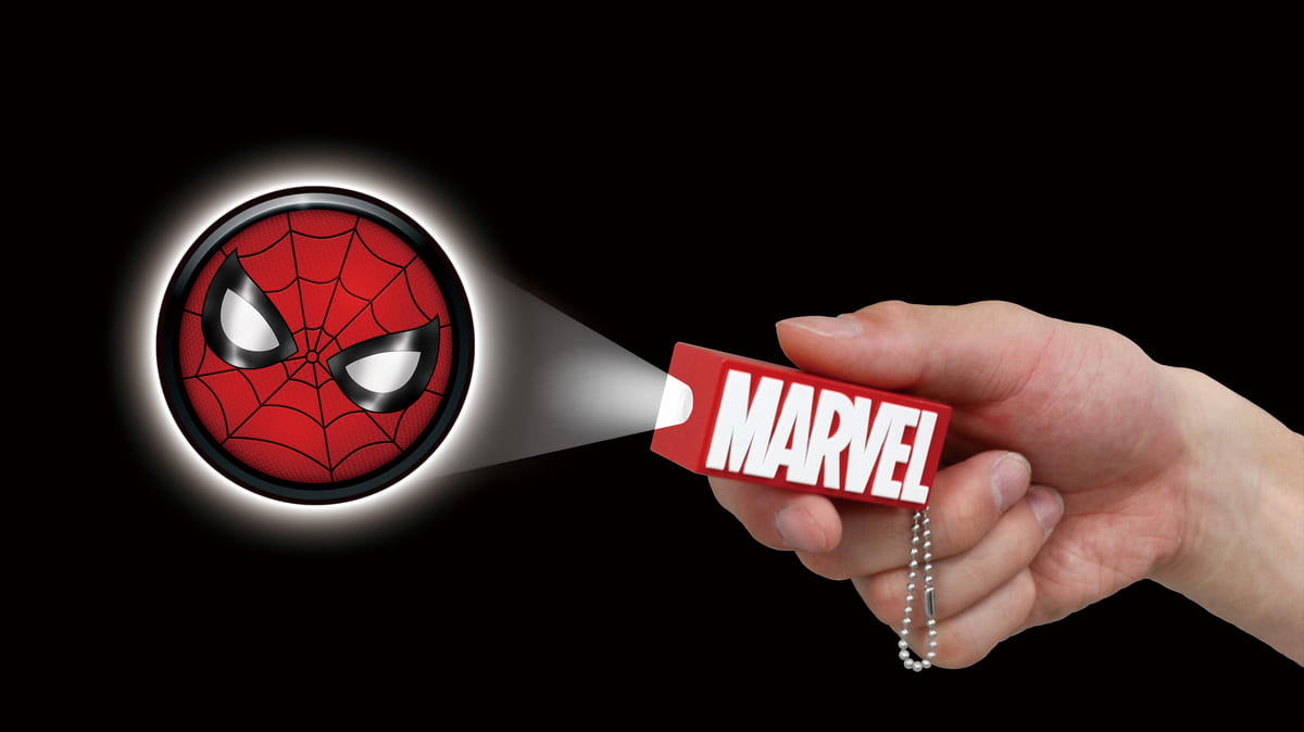 「スパイダーマン」のフェイスデザインが投影される、プロジェクションキーホルダー。