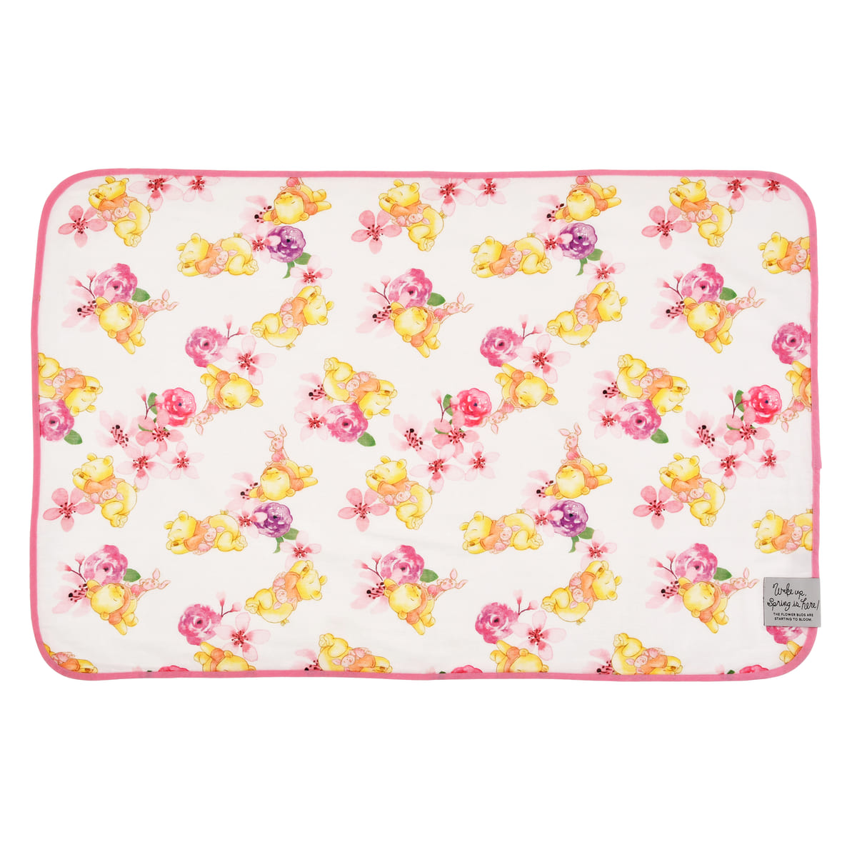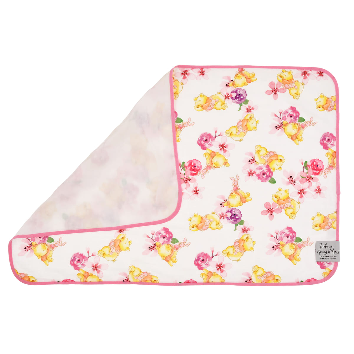 「プーさん」と「ピグレット」とともに、ピンク色の大輪の花を描いた「ブランケット」