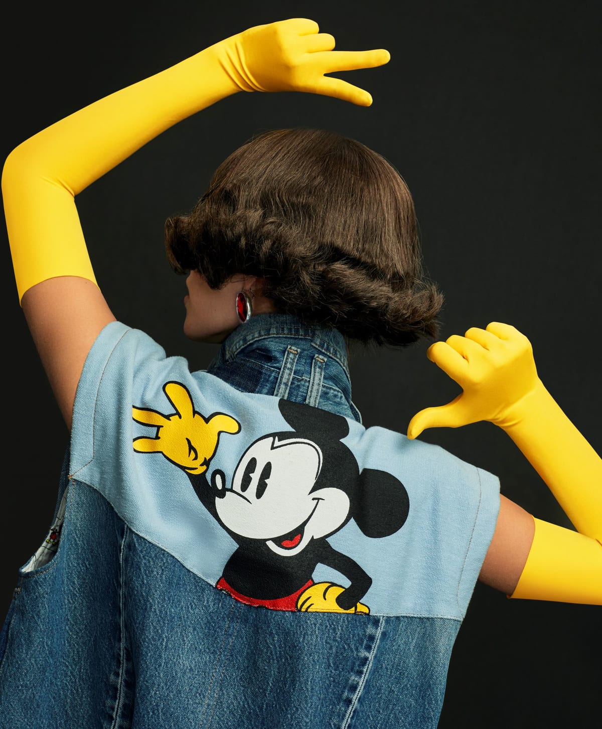 手を振っている「ミッキーマウス」が背中にプリントされた、アップサイクルなデニムジャケット。