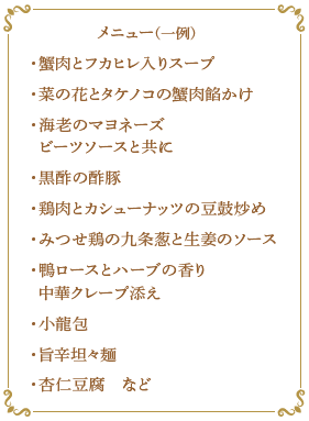 メニューは本格中国料理の蟹肉とフカヒレ入りスープ、海老のマヨネーズビーツソースをはじめ、全34品のラインナップ。