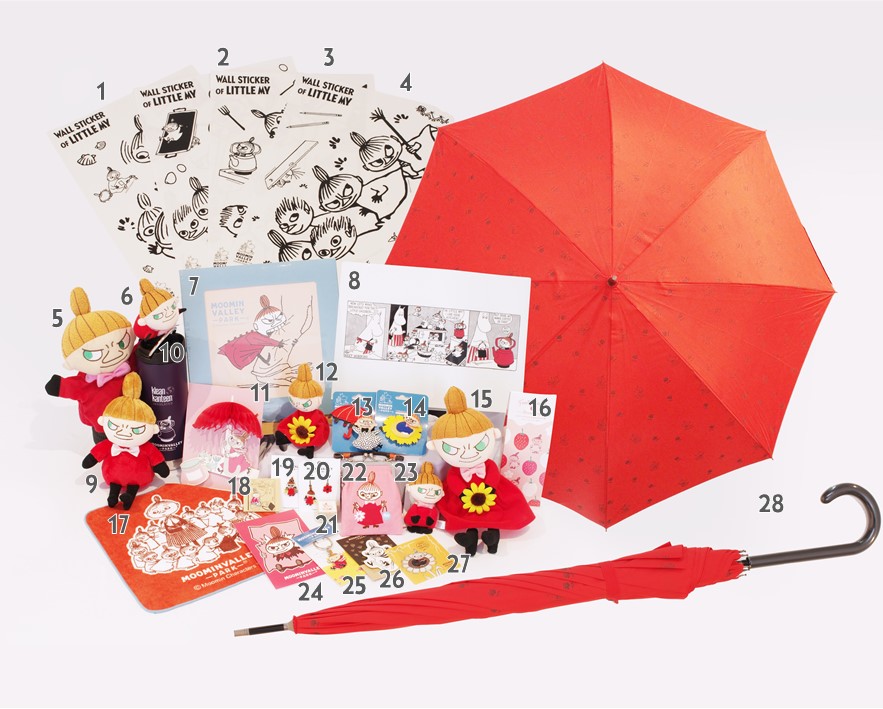 そんなドタバタ騒ぎを、「リトルミイ」のワンピースを象徴する「赤」を基調としたアンブレラのデザインとともに、登場するムーミン谷の仲間たちが勢ぞろいして再現。