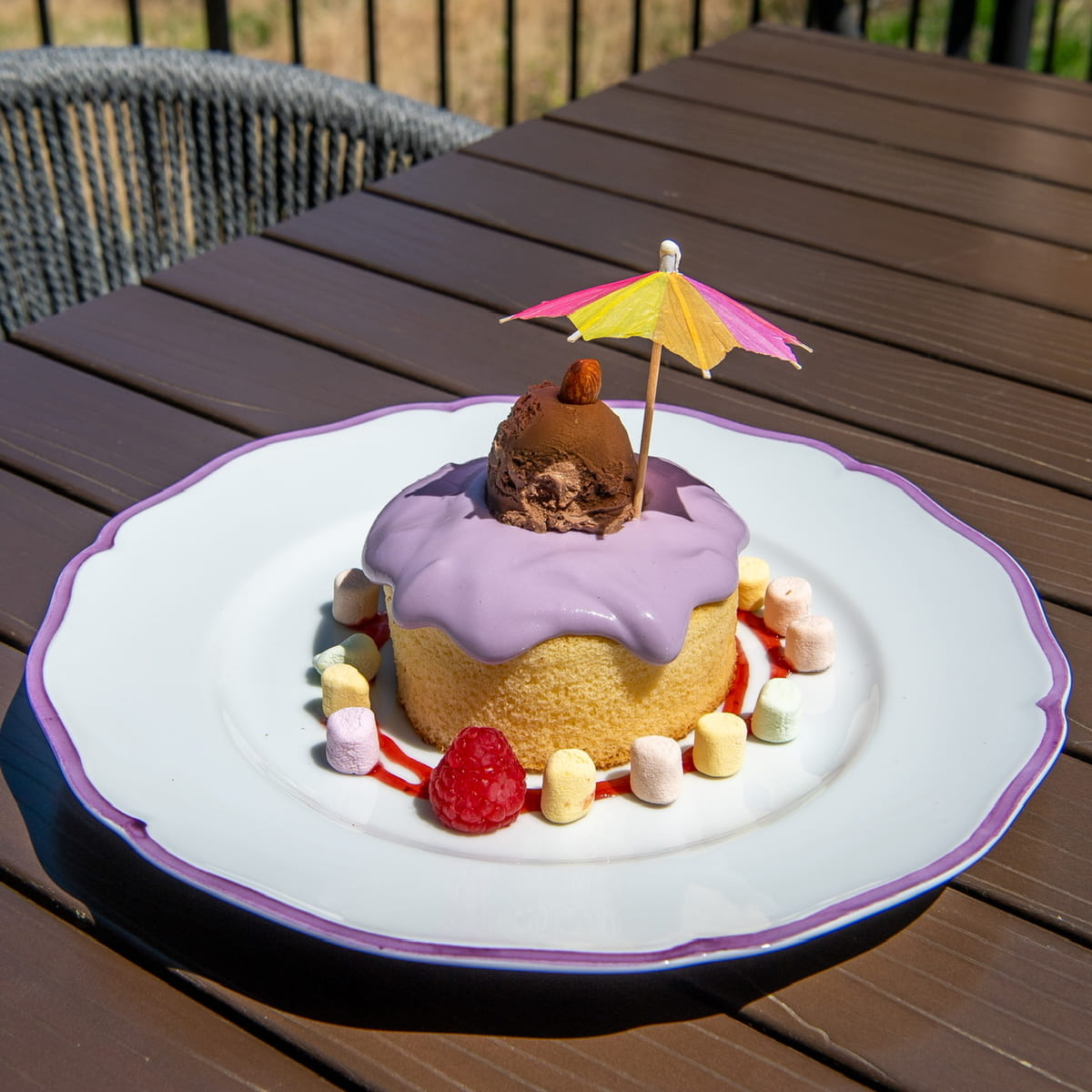 紫のクリームはバタフライピーで色付けした、甘酸っぱい爽やかな味わい。