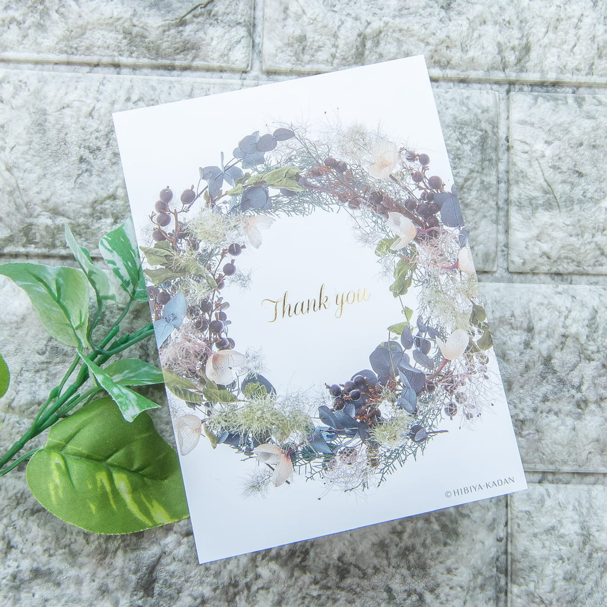 感謝の気持ちをフラワーリースで囲んだ、すてきなポストカードです。