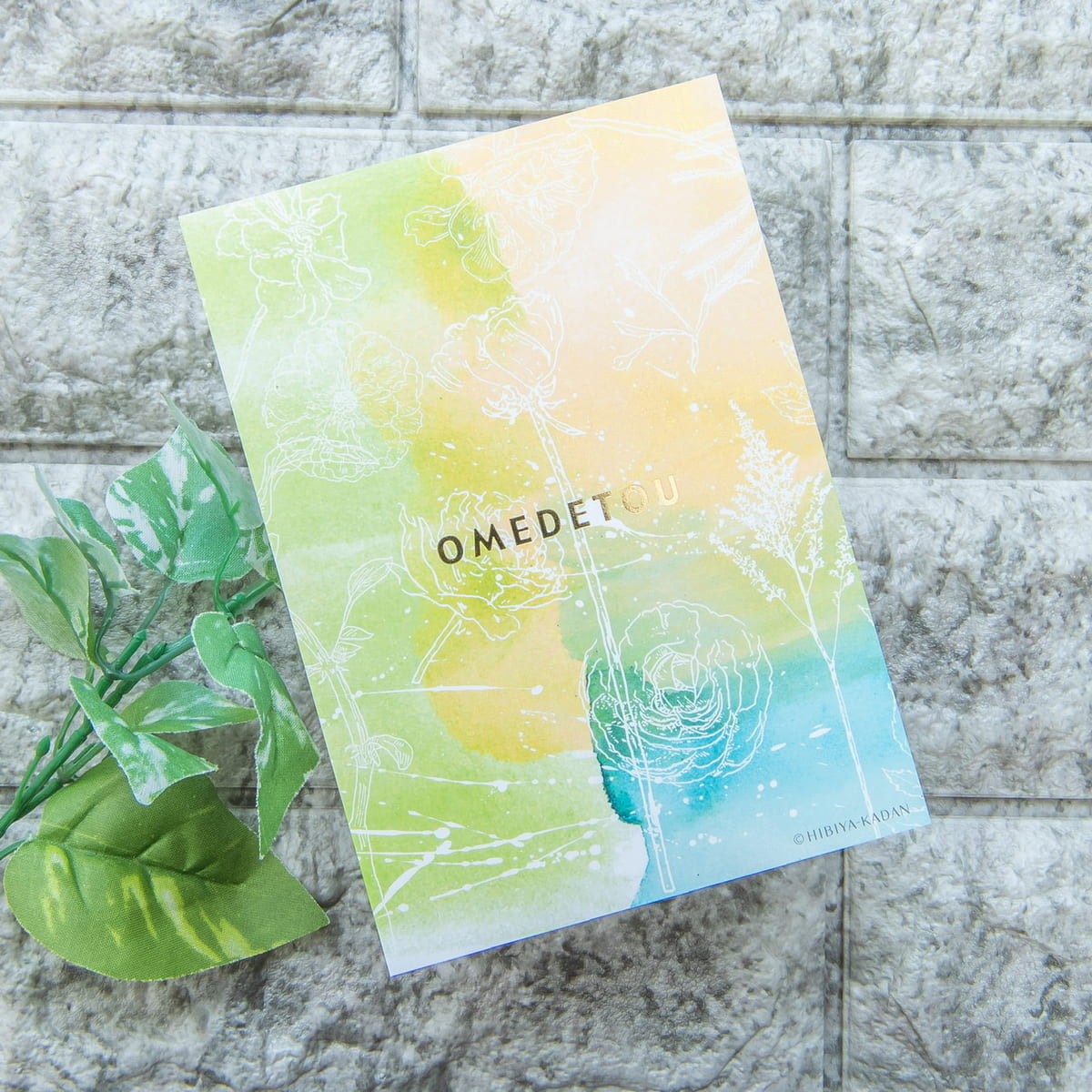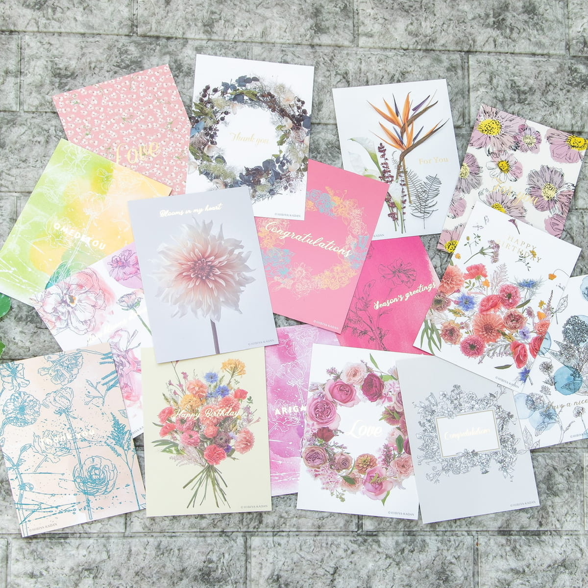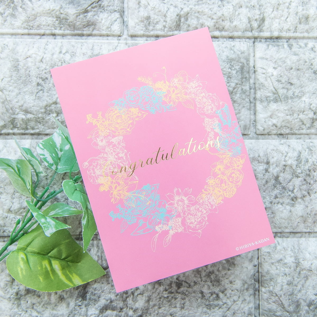 色とりどりのお花の上には、「Happy birthday」や「Congratulations」など、シーンに合わせたフレーズが箔であしらわれています。