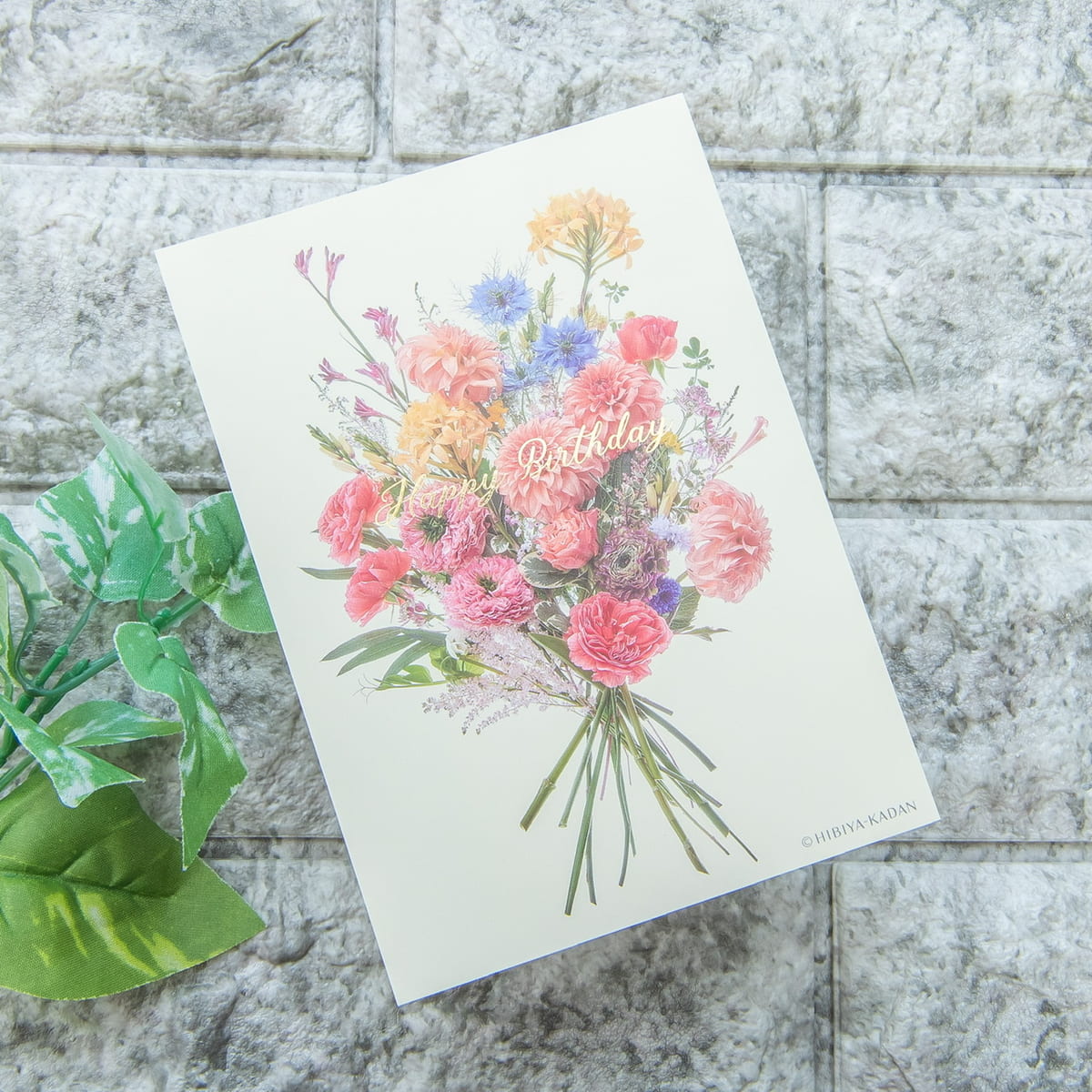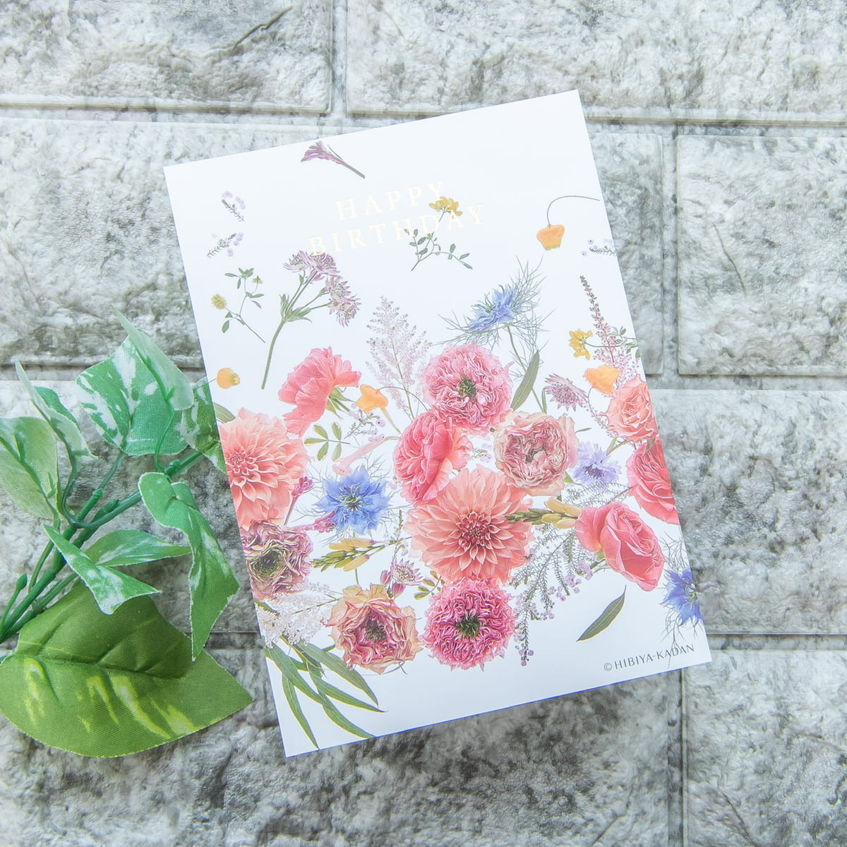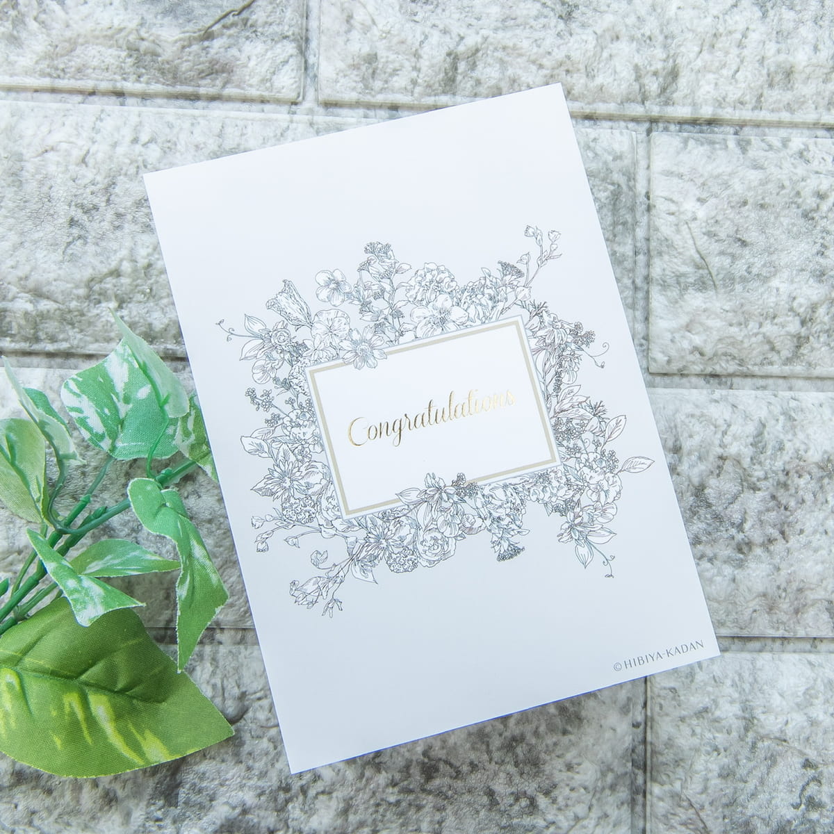 色とりどりのお花の上には、「Happy birthday」や「Congratulations」など、シーンに合わせたフレーズが箔であしらわれています。