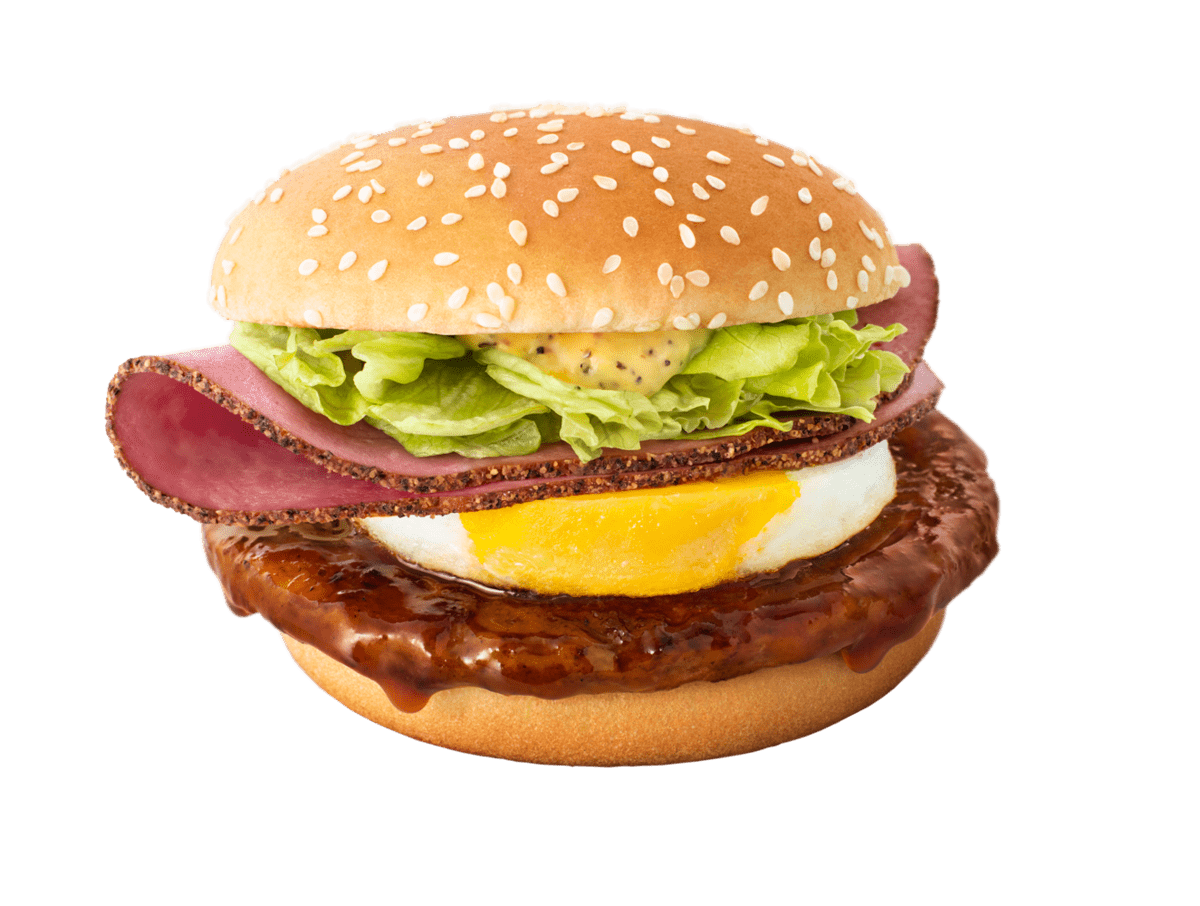 ポークパティとてりやきソース、ぷるぷるたまごとレタスにふたつ折りのパストラミビーフを重ね、ゴマ付きバンズでサンドした一品。
