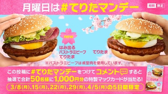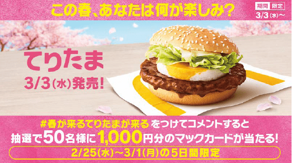 抽選でマックカードが当たる「#春が来るてりたまが来る」と、コメントして当たる「#3月3日はてりたまつり」、さらに月曜日限定の「#てりたマンデー」キャンペーンと、3本立てで展開されます。