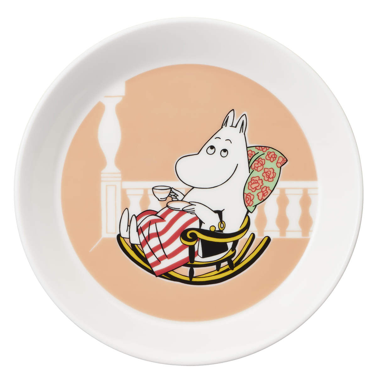 ムーミンハウスを訪れるあらゆる人のケアをする「ムーミンママ」の、バルコニーでのひと休みがデザインされています。