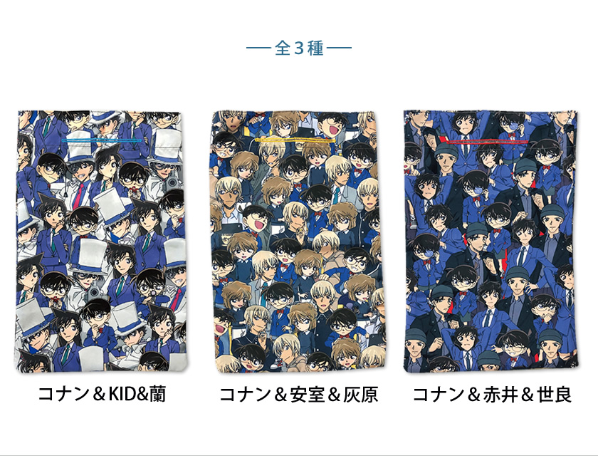 主人公「江戸川コナン」の他、「毛利蘭」と「怪盗キッド」の総柄デザイン。