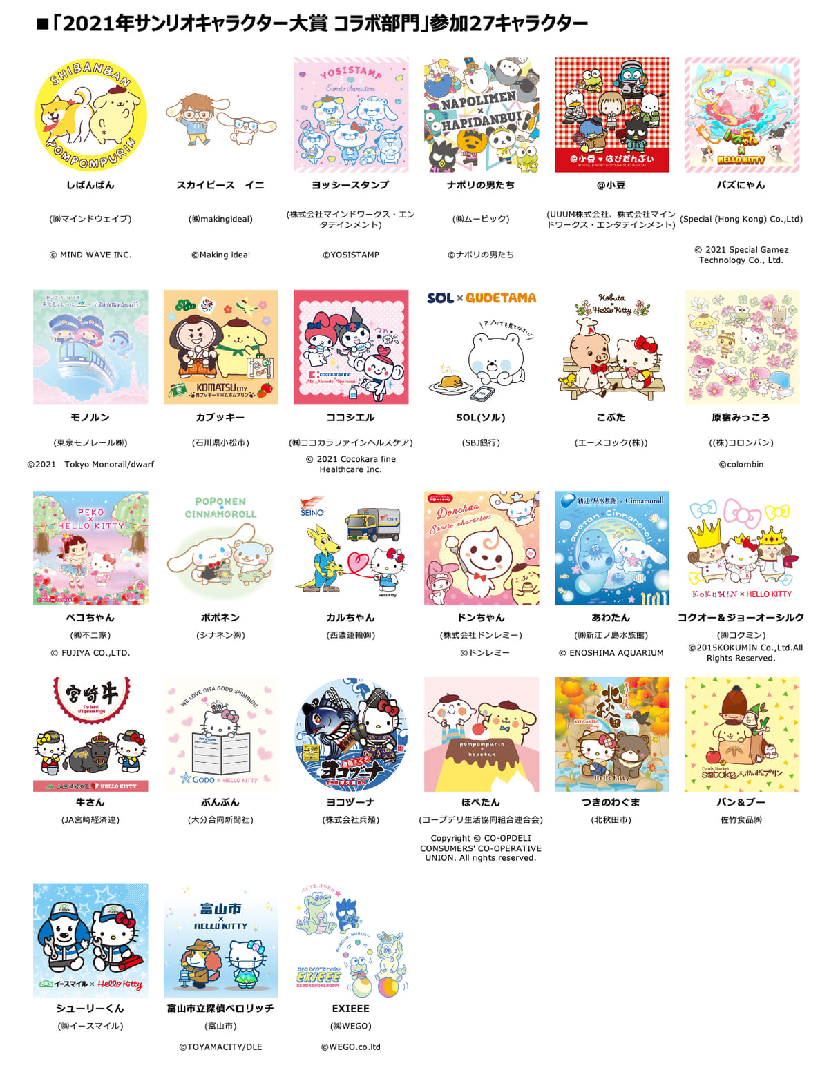 同時開催となる。企業や地方自治体のキャラクターとサンリオキャラクターがコラボした27組がエントリーする「2021年サンリオキャラクター大賞コラボ部門」